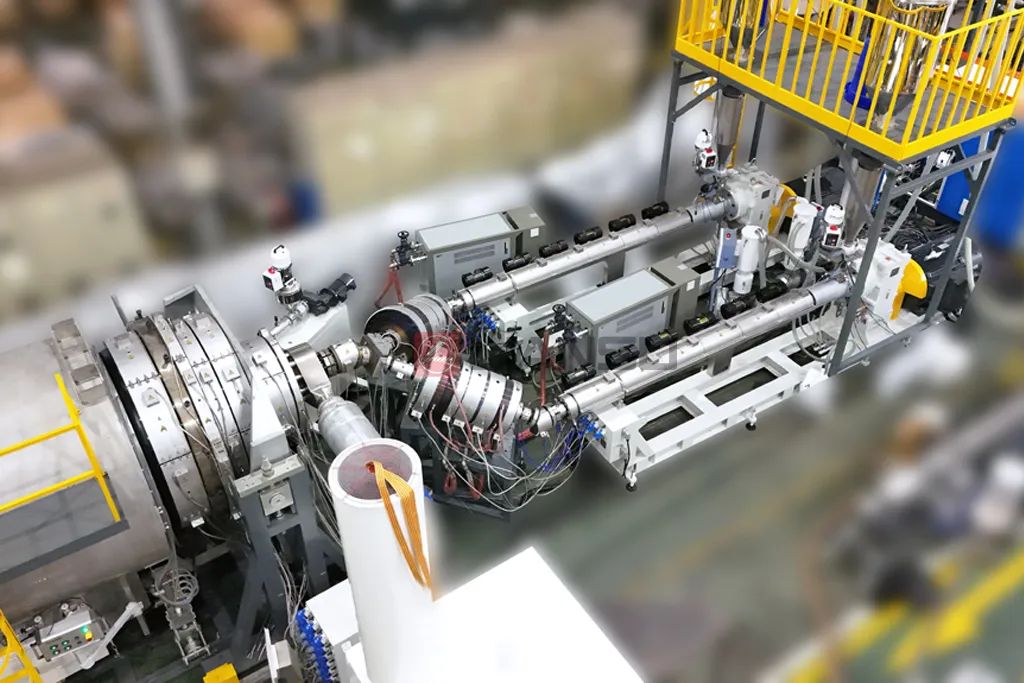 Extrusion line adopt integrated loss-in-weight dosing of main materials and masterbatches to achieve on line accurate dosing and flexible color switching. 40L/D screw is matched with spiral feed bushing to improve plasticizing efficiency and achieve high production and energy saving. Melt cooler and spiral pipe head ensure uniform melt and reduce sag and wall thickness deviation. Vacuum tank adopts closed-loop control cooling and rapid forming ensure pipe size and energy saving. Haul off and cutter adopts servo control to ensure stable and efficient operation.